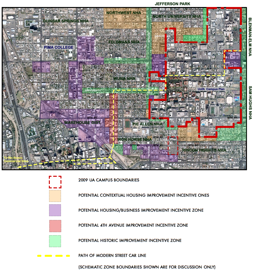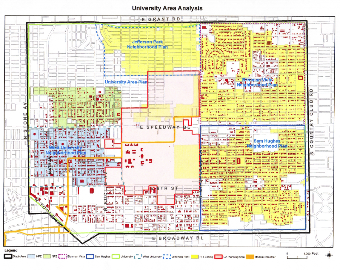 The May 4th Urban University Interface exploratory meeting sparked some ideas worth pursuing. With the LUC Committee busy completing its LUC revisions and the Downtown Core District Plan, neighborhoods need to look towards their own improvements using similar incentive strategies. Individuals from West University, Feldmans, Jefferson Park and Blenman-Elm Neighborhoods converged with architects, planners and community members to engage in a conversation about reversing a 3 decade trend of deterioration and dis-investment in key university neighborhood edges and interiors. Discussions centered around stabilizing key residential edges around the university through incentive strategies paired with similar strategies to accommodate compact student housing solutions in appropriate areas outside of neighborhoods . Hopes are to attract faculty, UA employees married students, upper year students and many potential home owners and families back into university neighborhoods. Below are some discussion tools that were used during the meeting. CLICK ON MAP TO ENLARGE